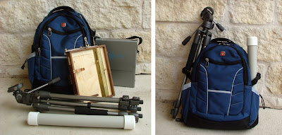 Below are a couple of photos of my plein air gear. I generally also include paper towels, wipes, and paint - it all fits nicely in my backpack. The pvc deal is a brush holder my husband made for me, and the box in back is my nifty panel holder from Raymar.